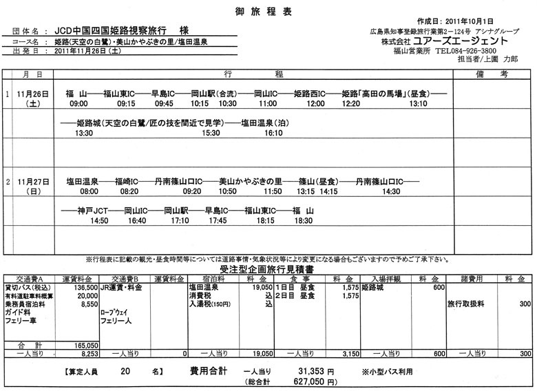 四国支部会員及賛助会員の皆様へ 2011年10月4日 会員の皆様行楽シーズン到来、今度こその中国支部企画再チャレンジ 。 今回は時期が紅葉に温泉にグルメにと、いい季節の開催となりました。 研修参加にご協力願います。 ■日時 11月26日(土)~27日(日) ■集合場所 岡山駅 10:30分 ■会費 31,353円(支部補助あり) スケジュールはページ下部に掲載しています。 参加希望の方は、10月中に【長尾】宛にメールでご連絡ください。