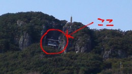 ふと山手を見ると断崖絶壁に何かの建物が。